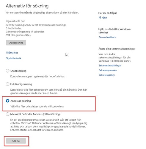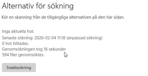- Microsoft Defender söker igenom allt i den valda mappen och levererar sökresultat efter operationen (bild nedan).