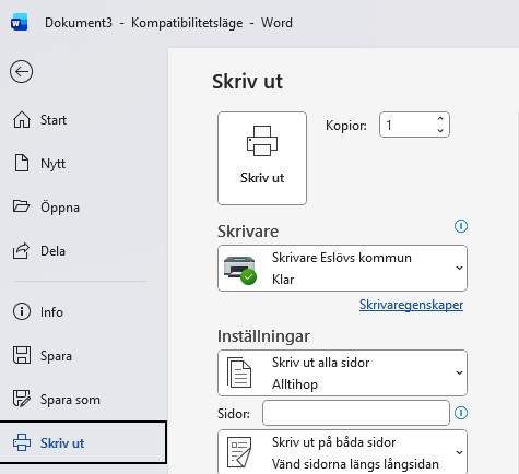 När du ska skriva ut från ett verksamhetssystem eller Officeprogram, välj Skriv ut och se till att den valda skrivaren heter Skrivare Eslövs kommun. Den kommer att ligga förvald efter din första utskrift.