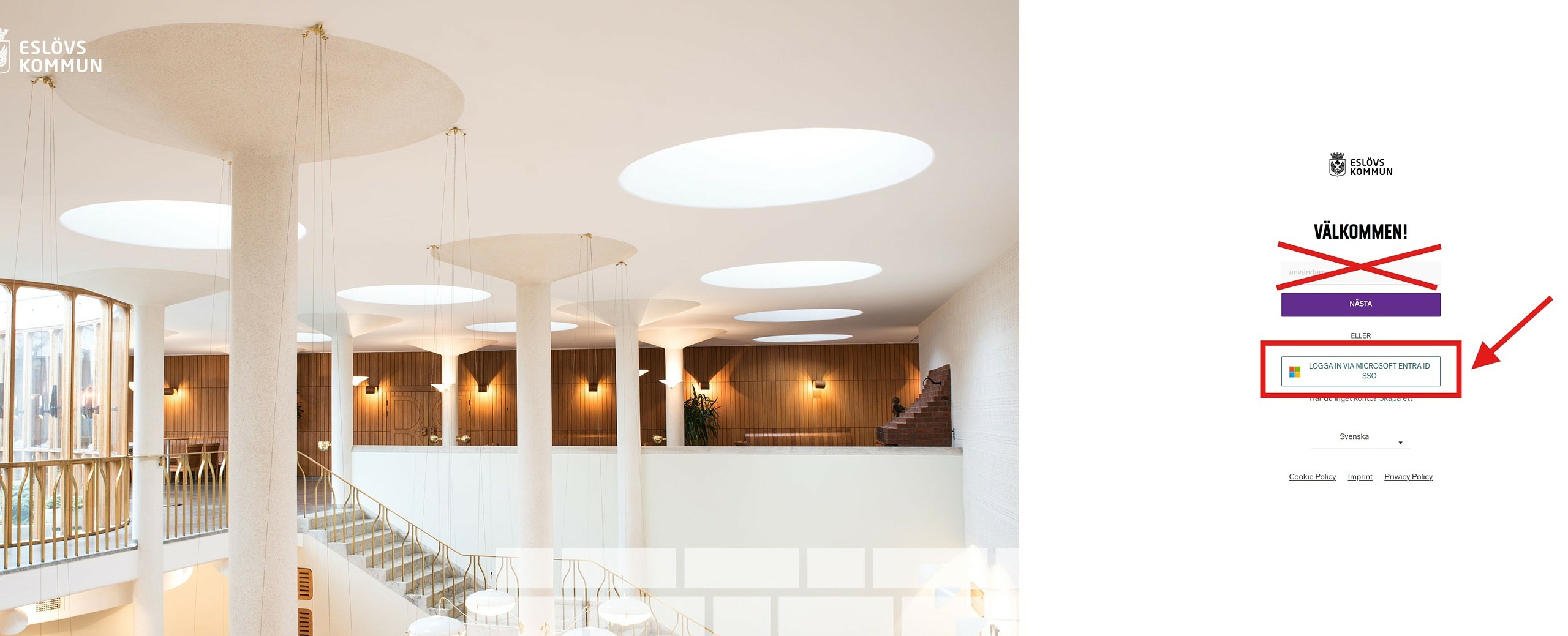 Nytt fönster öppnas, klicka på knappen i den röda ramen (med texten: Logga in via Microsoft EntraID SSO), punkt 2.