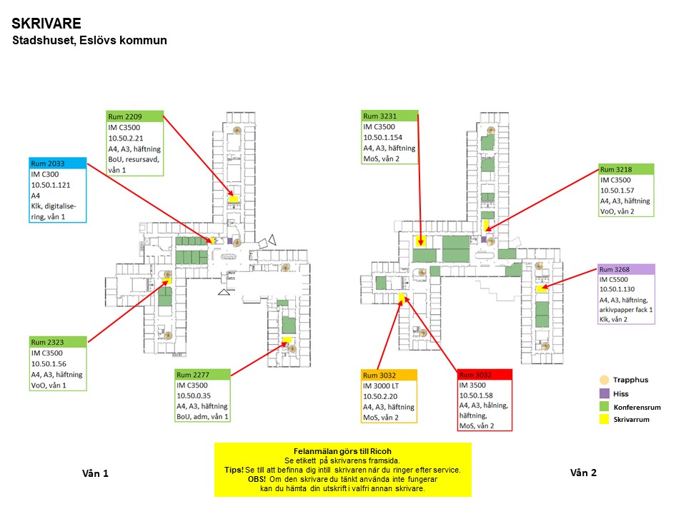 I stadshuset finns många skrivare. För att förenkla och hjälpa dig att hitta rätt finns här en karta som visar var skrivarna finns och vilka funktioner de har.